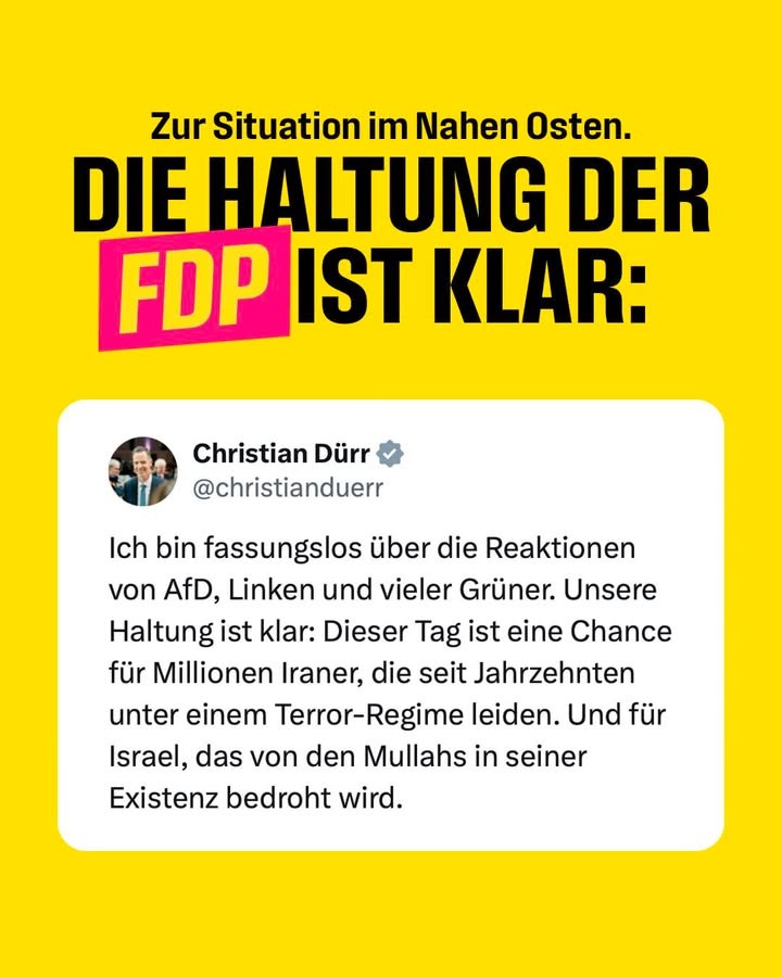 Heute ist es wichtiger denn je, nicht zu schweigen: Wir Freie Demokraten bekennen uns zu Israels Recht auf Verteidigung. Wir stehen als FDP an der Seite aller Menschen, die im Iran jeden Tag auf die Straße gehen, um für ein Leben in Freiheit zu kämpfen. #amisraelchai #FreeIran
